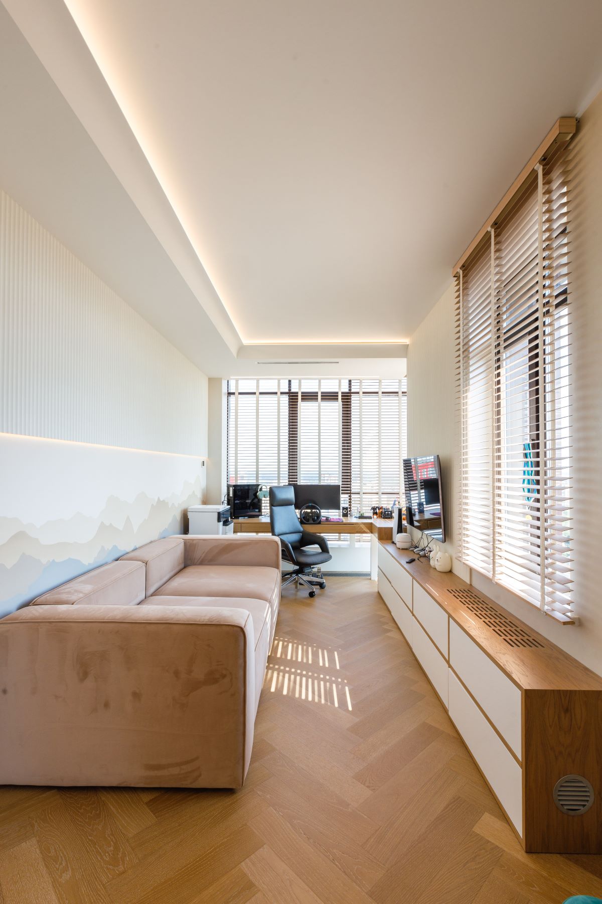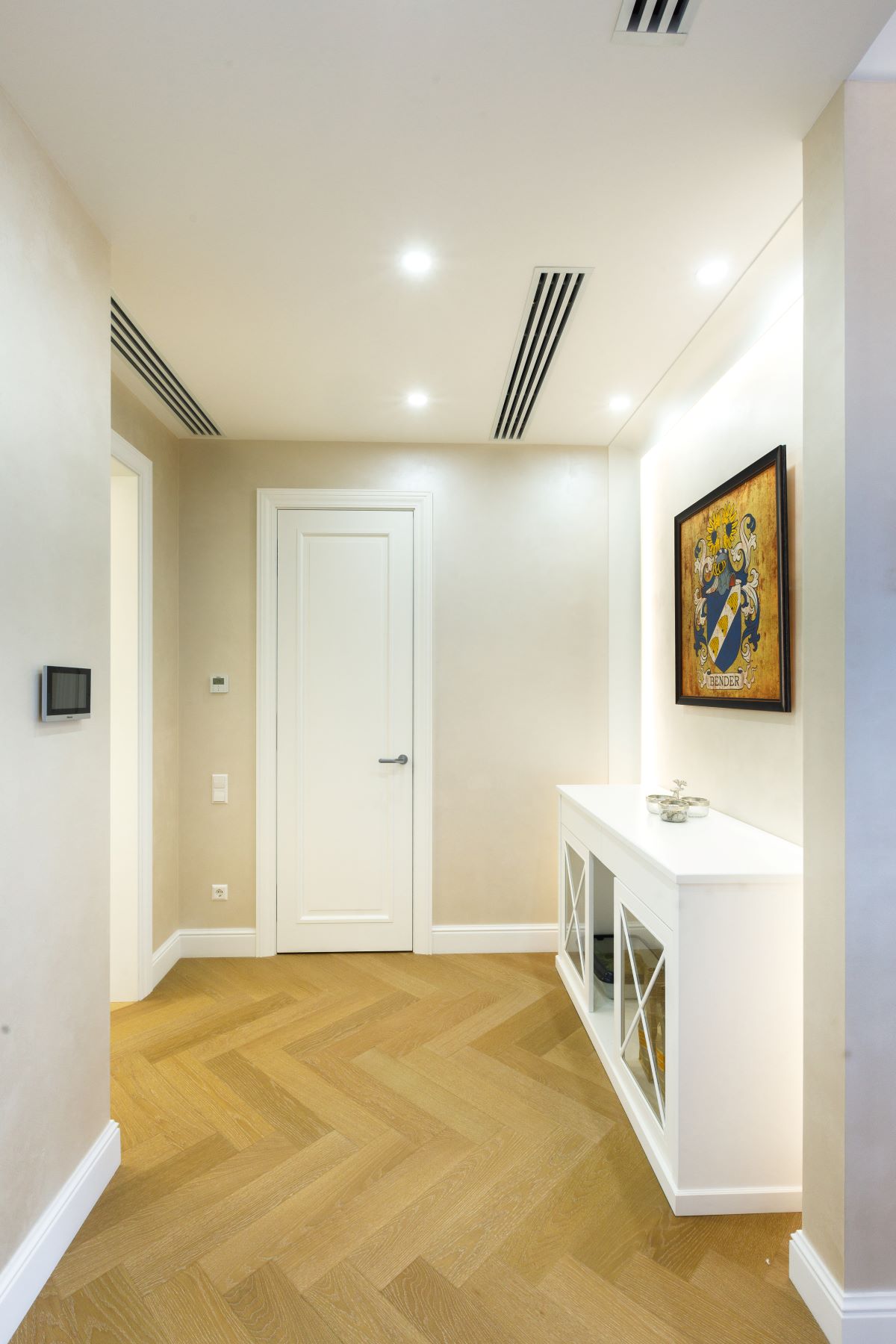 Чистота белого и геометрия линий смягчаются деревом и мягким матовым текстилем.