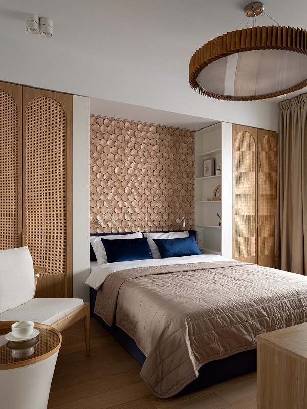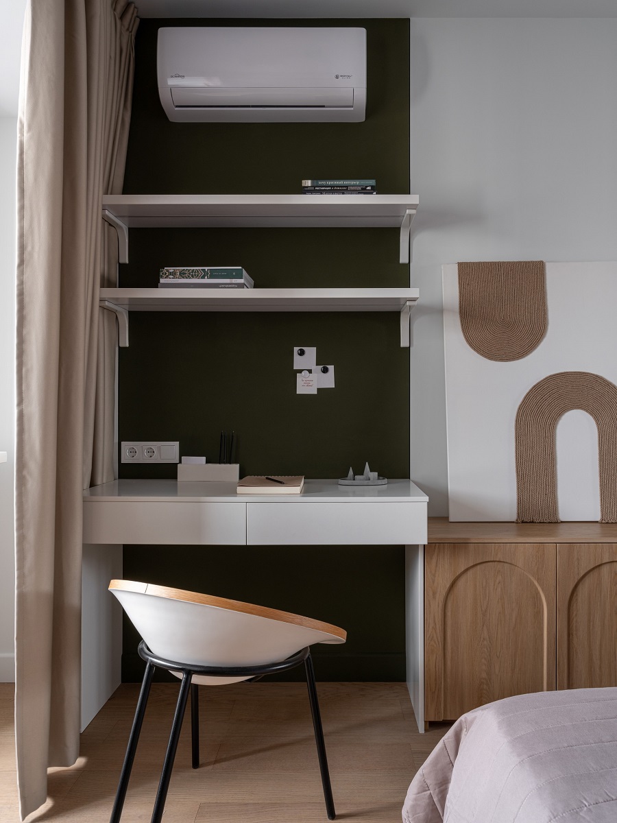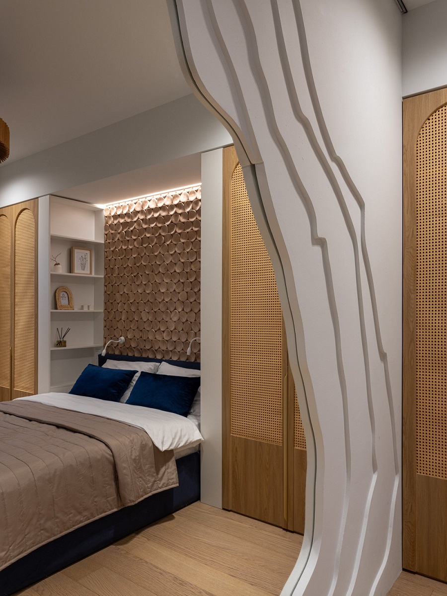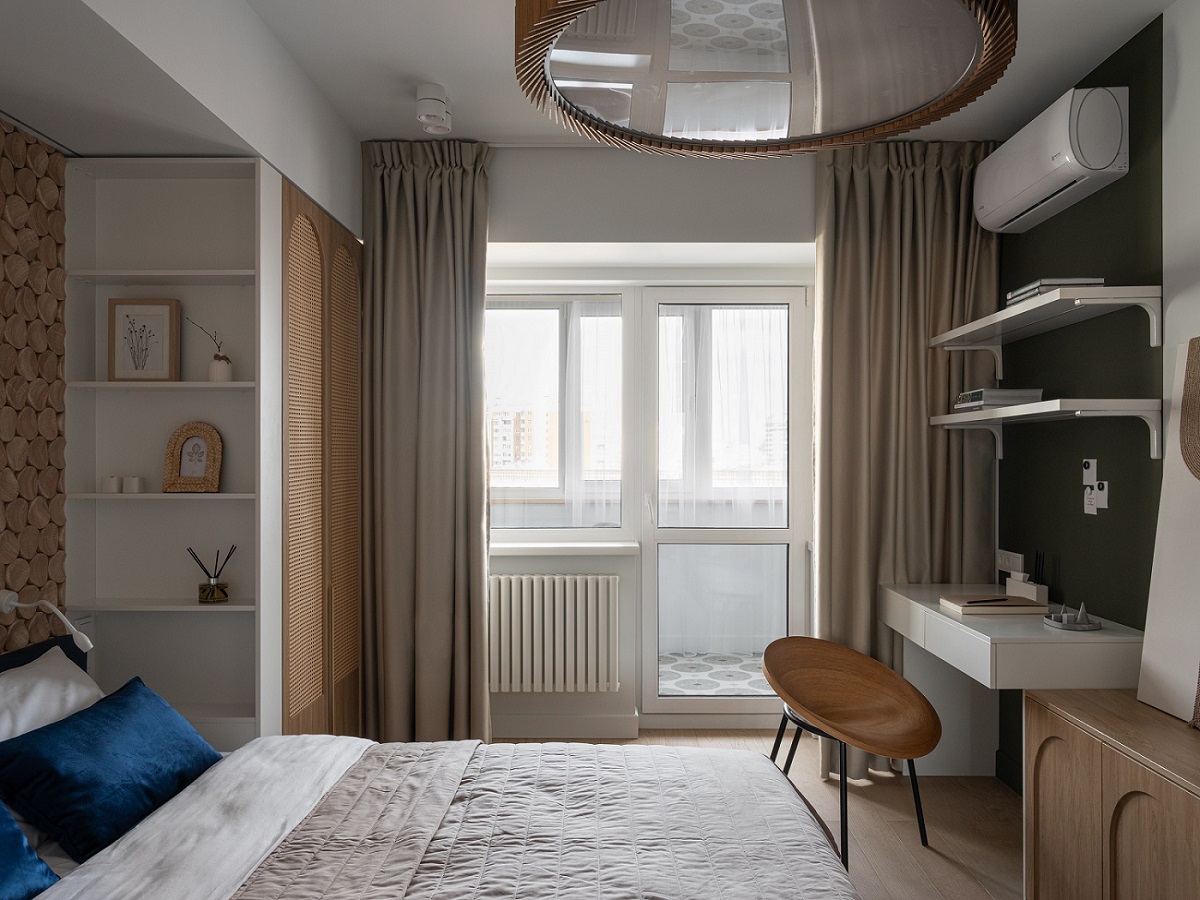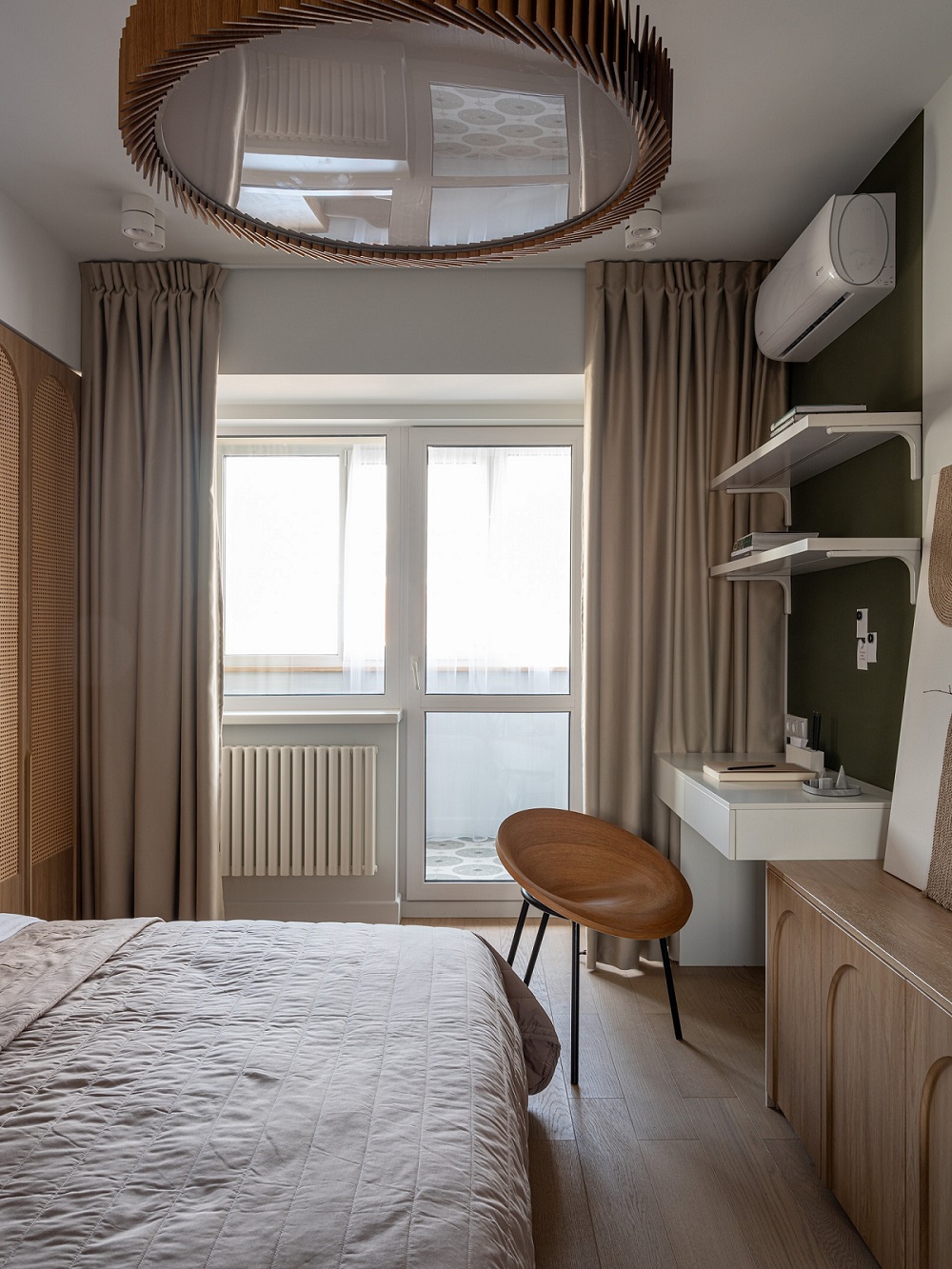 Спальня с дырой неправильной формы в стене — это необычный проект дизайнера интерьеров Натальи Корнюхиной. Сочетание синего тона глубоких вод и тёмно-зеленого создали в этой спальне особую атмосферу близости к природе.
